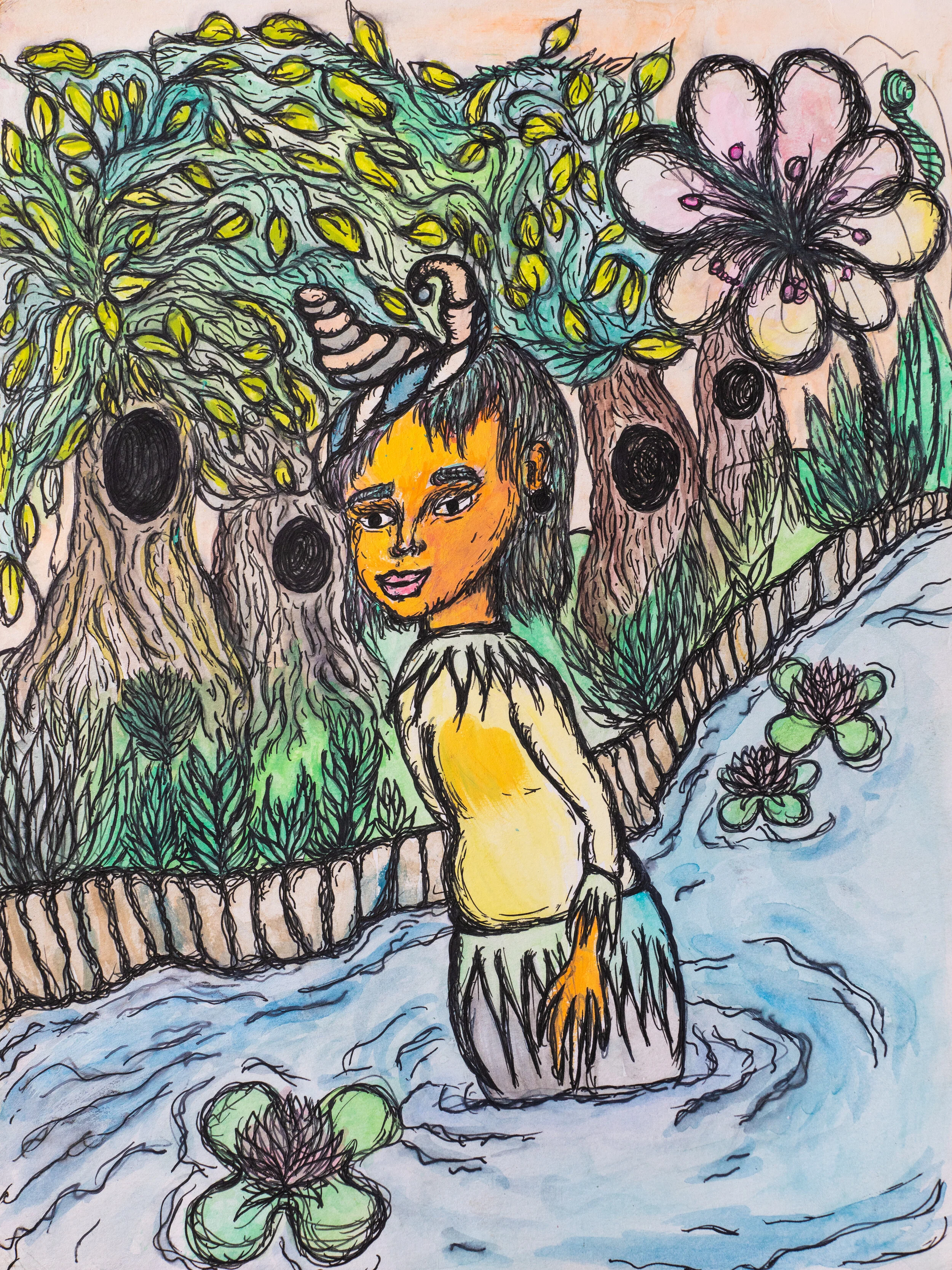 "Forest Nymph at the Bank of the River" - Pen and Watercolor on Paper - August 2017